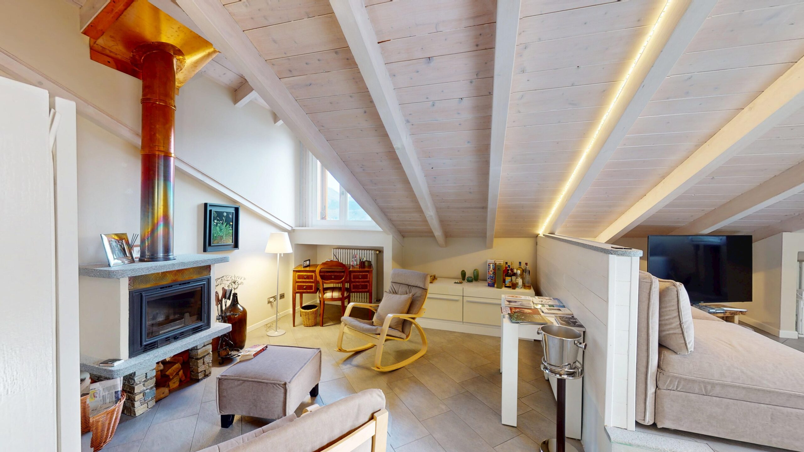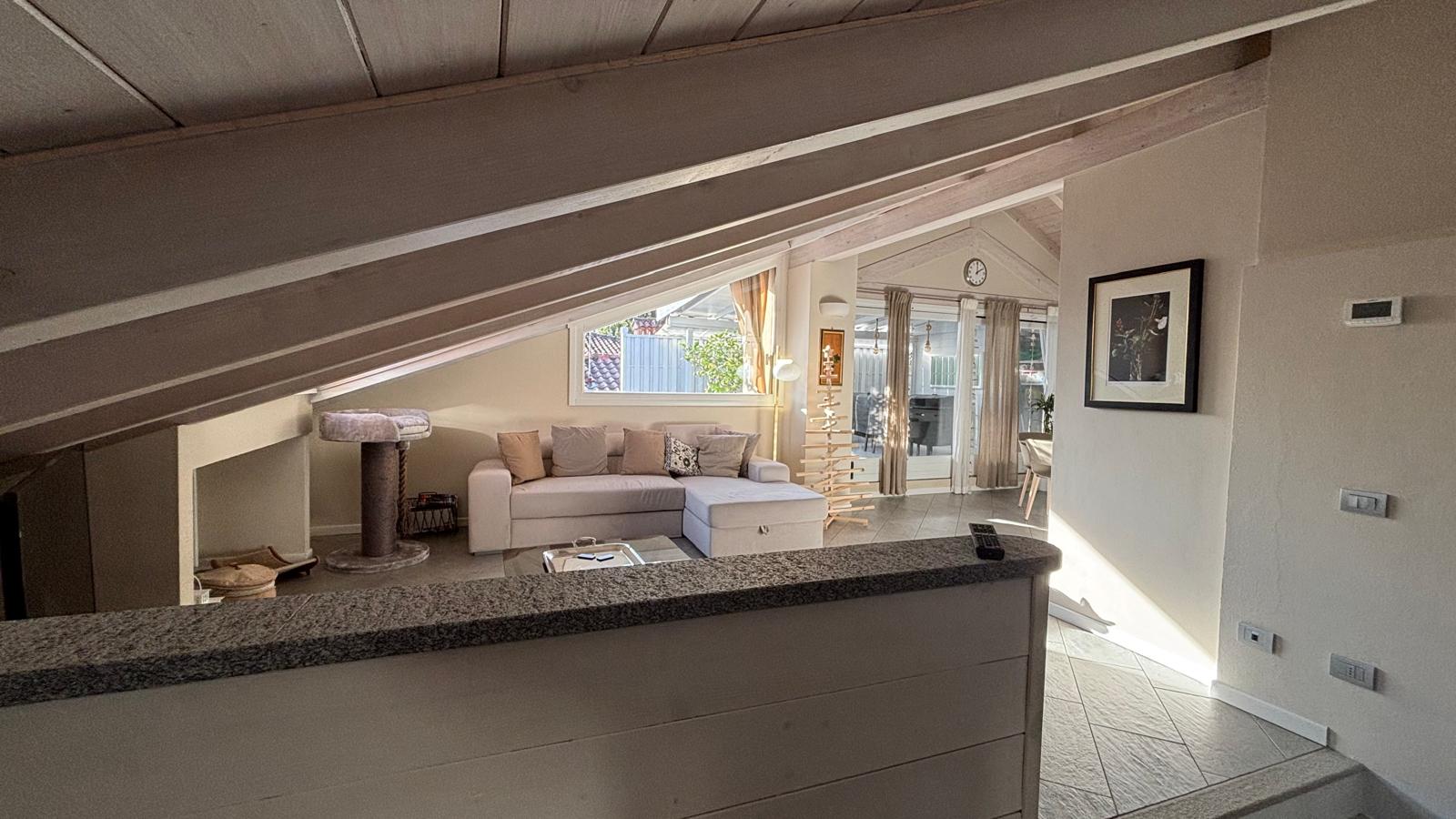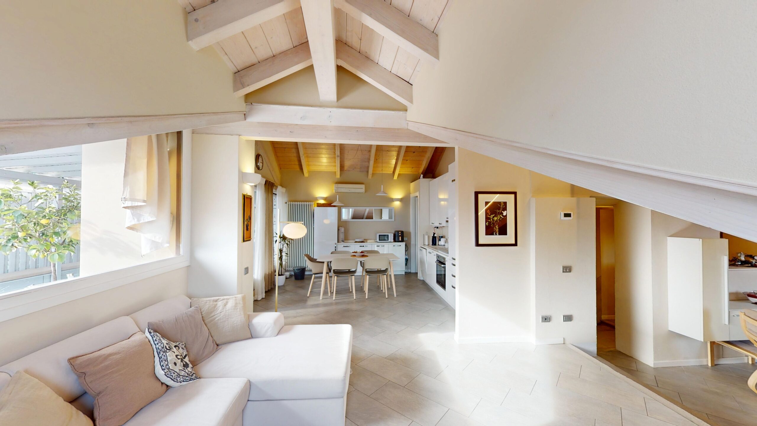 L’abitazione si sviluppa su un unico livello e accoglie con un ampio e luminoso soggiorno living, arricchito da camino e zona lettura, ideale per momenti di relax. Due scalini conducono alla zona tinello con divano e cucina, creando una piacevole divisione degli spazi pur mantenendo un’ottima continuità. A servizio della zona giorno troviamo un bagno finestrato con doccia e lavanderia.